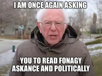 Epistemic trust is not just vital at the interpersonal level; it is vital at the larger societal level. When you begin to build a society that relies on various forms of epistemic violence in order to fulfill will to power, you put all of us in an environment in which our epistemic trust is compromised, and in which epistemic hypervigilance and rigidity become understandable effects. Psychic equivalence reigns under fascism—I feel it, so it must be so. Propaganda, paranoia, are operating in what Fonagy et al think of as the pretend mode.